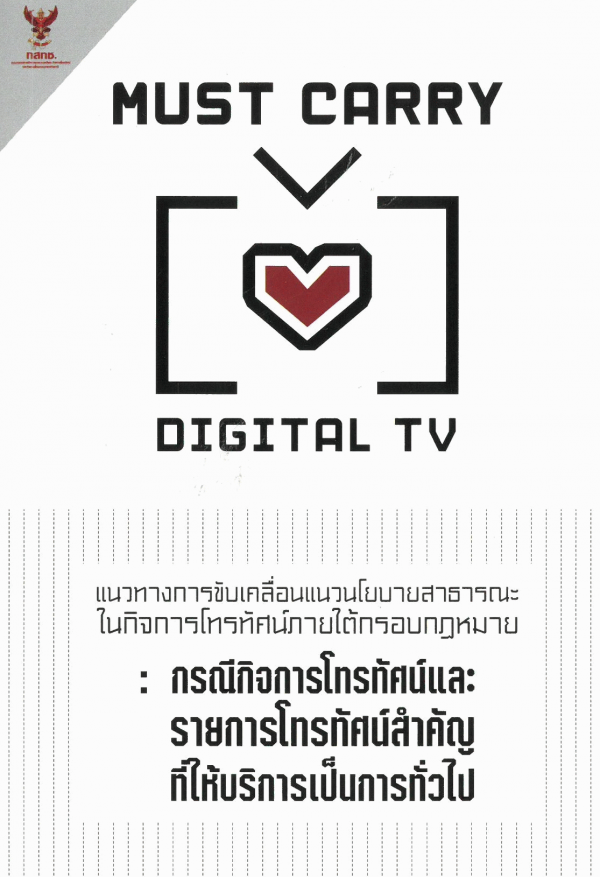 แนวทางการขับเคลื่อนแนวนโยบายสาธารณะในกิจการโทรทัศน์ภายใต้กรอบกฎหมาย : กรณีกิจการโทรทัศน์และรายการโทรทัศน์สำคัญที่ให้บริการเป็นการทั่วไป = Must carry digital TV = สำนักงานคณะกรรมการกิจการกระจายเสียง กิจการโทรทัศน์ และกิจการโทรคมนาคมแห่งชาติ [book]