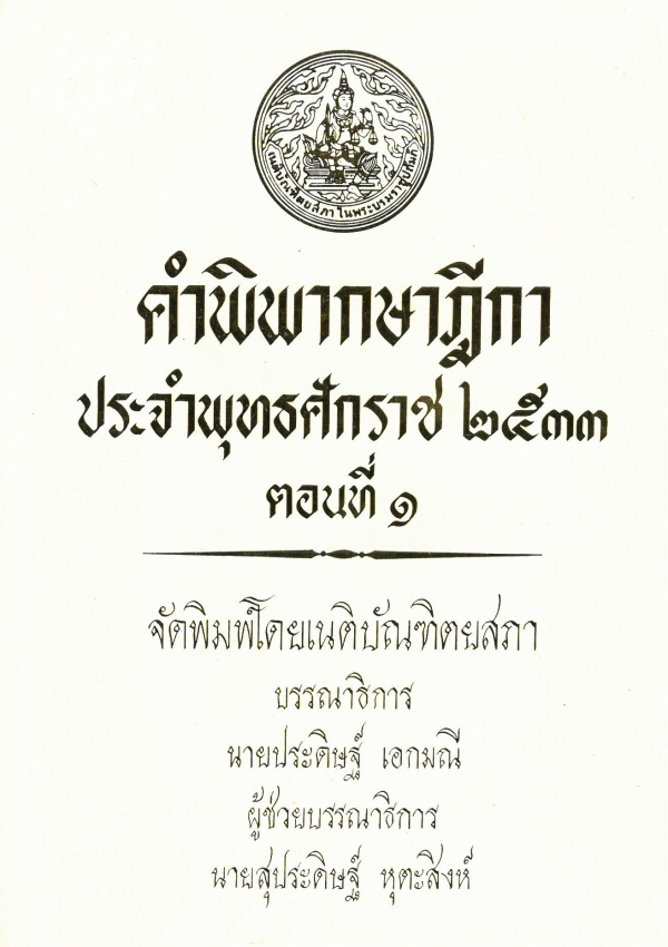 คำพิพากษาฎีกา ประจำพุทธศักราช 2533 ตอนที่ ... / จัดพิมพ์โดยเนติบัณฑิตยสภา ; ประดิษฐ์ เอกมณี บรรณาธิการ ; สุประดิษฐ์ หุตะสิงห์ ผู้ช่วยบรรณาธิการ