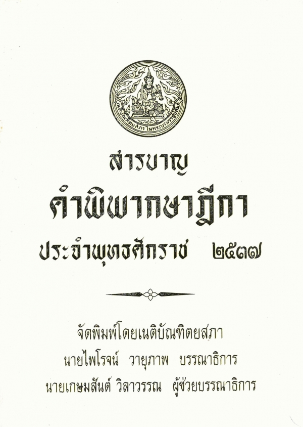 สารบาญคำพิพากษาฎีกา ประจำพุทธศักราช 2537 / จัดพิมพ์โดยเนติบัณฑิตยสภา ;ไพโรจน์ วายุภาพ บรรณาธิการ ; เกษมสันต์ วิลาวรรณ ผู้ช่วยบรรณาธิการ