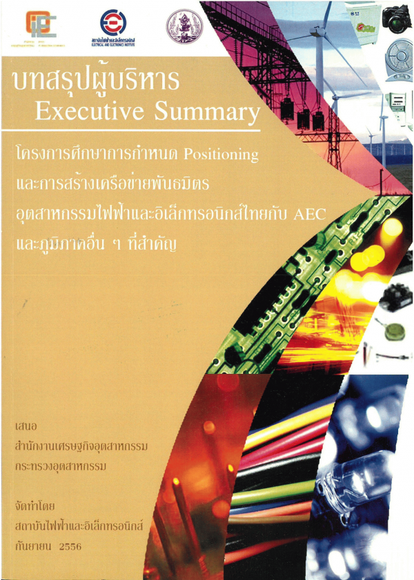 บทสรุปผู้บริหาร Executive summary : โครงการศึกษาการกำหนด Positioning และการสร้างเครือข่ายพันธมิตรอุตสาหกรรมไฟฟ้าและอิเล็กทรอนิกส์ไทยกับ AEC และภูมิภาคอื่นๆ ที่สำคัญ / จัดทำโดย สถาบันไฟฟ้าและอิเล็กทรอนิกส์
