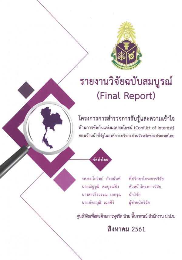 รายงานวิจัยฉบับสมบูรณ์ โครงการการสำรวจการรับรู้และความเข้าใจด้านการขัดกันแห่งผลประโยชน์ (Conflict of interest) ของเจ้าหน้าที่รัฐในองค์การบริหารส่วนจังหวัดของประเทศไทย / จัดทำ โดย ณัฐวุฒิ สมบูรณ์ยิ่ง หัวหน้าโครงการ ; ศูนย์วิจัยเพื่อต่อต้านการทุจริต ป๋วย อึ๊งภากรณ์ สำนักงาน ป.ป.ช
