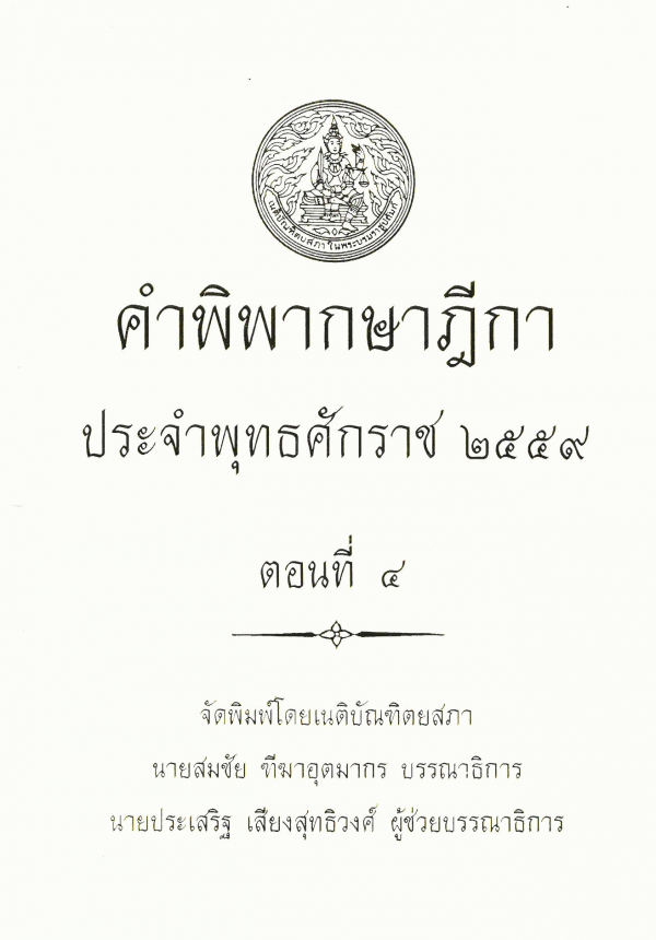 คำพิพากษาฎีกา ประจำพุทธศักราช 2559 ตอนที่ 4 / จัดพิมพ์โดยเนติบัณฑิตยสภา ; สมชัย ฑีฆาอุตมากร บรรณาธิการ ; ประเสริฐ เสียงสุทธิวงศ์ ผู้ช่วยบรรณาธิการ