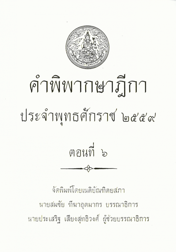 คำพิพากษาฎีกา ประจำพุทธศักราช 2559 ตอนที่ 6 / จัดพิมพ์โดยเนติบัณฑิตยสภา ; สมชัย ฑีฆาอุตมากร บรรณาธิการ ; ประเสริฐ เสียงสุทธิวงศ์ ผู้ช่วยบรรณาธิการ
