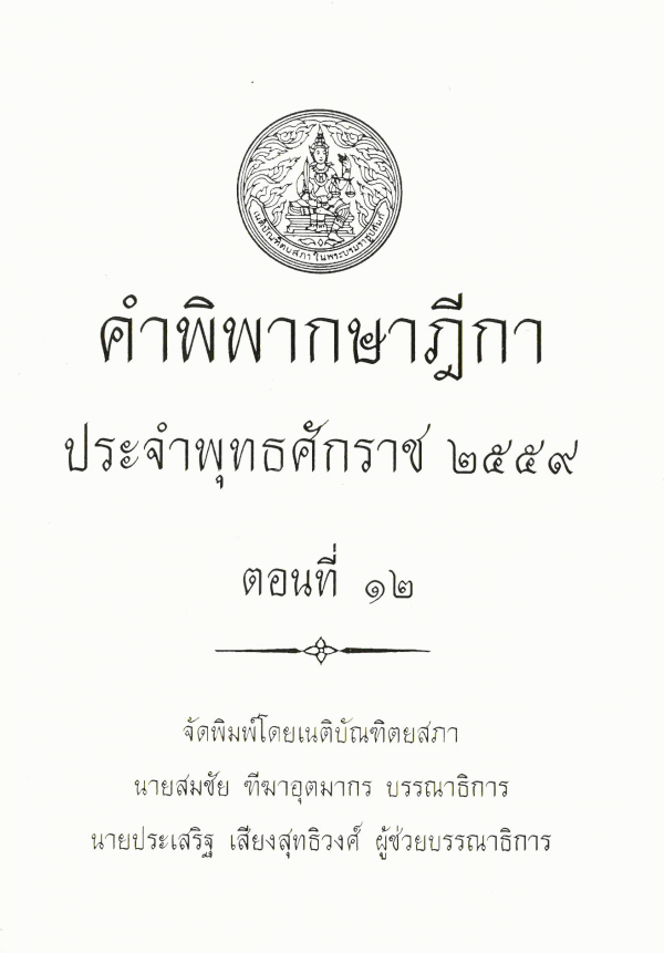 คำพิพากษาฎีกา ประจำพุทธศักราช 2559 ตอนที่ 12 / จัดพิมพ์โดยเนติบัณฑิตยสภา ; สมชัย ฑีฆาอุตมากร บรรณาธิการ ; ประเสริฐ เสียงสุทธิวงศ์ ผู้ช่วยบรรณาธิการ