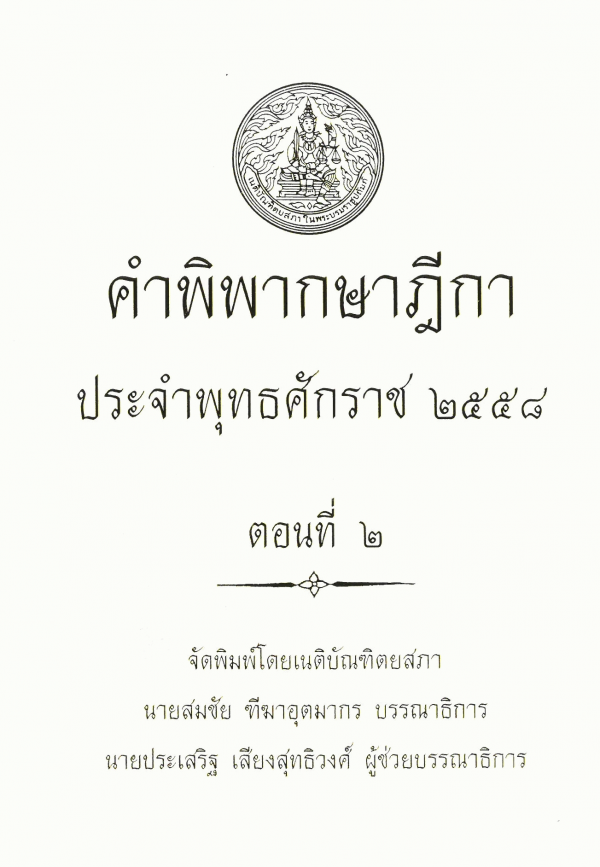 คำพิพากษาฎีกา ประจำพุทธศักราช 2558 ตอนที่ 2 / จัดพิมพ์โดยเนติบัณฑิตยสภา ; สมชัย ฑีฆาอุตมากร บรรณาธิการ ; ประเสริฐ เสียงสุทธิวงศ์ ผู้ช่วยบรรณาธิการ