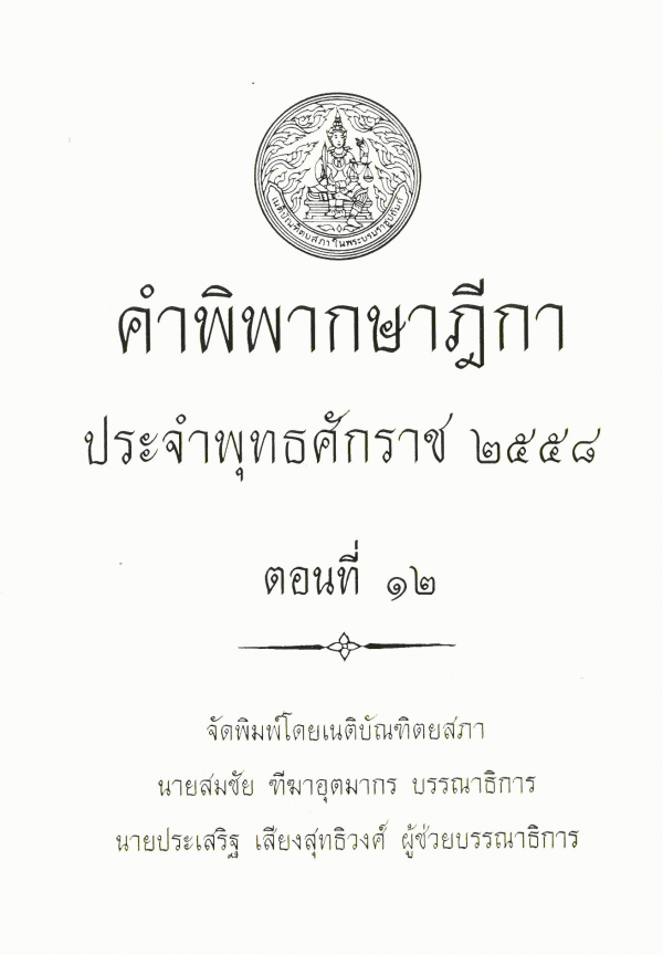คำพิพากษาฎีกา ประจำพุทธศักราช 2558 ตอนที่ 12 / จัดพิมพ์โดยเนติบัณฑิตยสภา ; สมชัย ฑีฆาอุตมากร บรรณาธิการ ; ประเสริฐ เสียงสุทธิวงศ์ ผู้ช่วยบรรณาธิการ