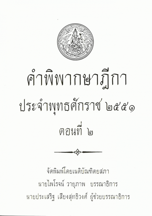 คำพิพากษาฎีกา ประจำพุทธศักราช 2551 ตอนที่ 2 / จัดพิมพ์โดยเนติบัณฑิตยสภา ; สมชัย ฑีฆาอุตมากร บรรณาธิการ ; ประเสริฐ เสียงสุทธิวงศ์ ผู้ช่วยบรรณาธิการ