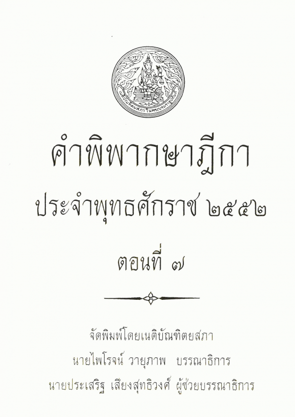 คำพิพากษาฎีกา ประจำพุทธศักราช 2552 ตอนที่ 7 / จัดพิมพ์โดยเนติบัณฑิตยสภา ; สมชัย ฑีฆาอุตมากร บรรณาธิการ ; ประเสริฐ เสียงสุทธิวงศ์ ผู้ช่วยบรรณาธิการ