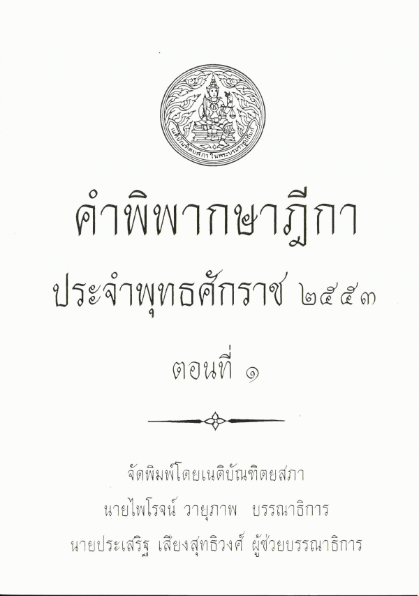 คำพิพากษาฎีกา ประจำพุทธศักราช 2553 ตอนที่ 1 / จัดพิมพ์โดยเนติบัณฑิตยสภา ; สมชัย ฑีฆาอุตมากร บรรณาธิการ ; ประเสริฐ เสียงสุทธิวงศ์ ผู้ช่วยบรรณาธิการ