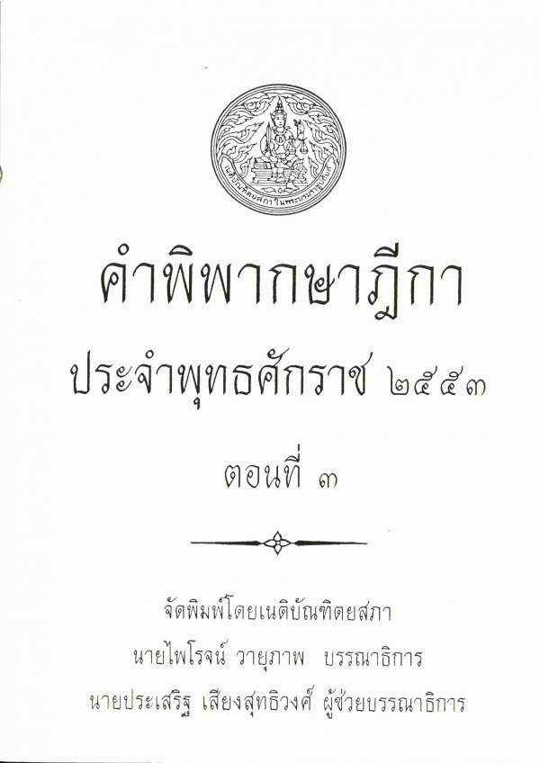 คำพิพากษาฎีกา ประจำพุทธศักราช 2553 ตอนที่ 3 / จัดพิมพ์โดยเนติบัณฑิตยสภา ; สมชัย ฑีฆาอุตมากร บรรณาธิการ ; ประเสริฐ เสียงสุทธิวงศ์ ผู้ช่วยบรรณาธิการ