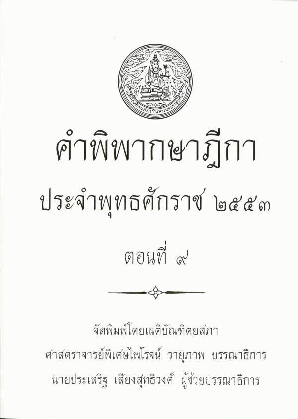 คำพิพากษาฎีกา ประจำพุทธศักราช 2553 ตอนที่ 9 / จัดพิมพ์โดยเนติบัณฑิตยสภา ; สมชัย ฑีฆาอุตมากร บรรณาธิการ ; ประเสริฐ เสียงสุทธิวงศ์ ผู้ช่วยบรรณาธิการ