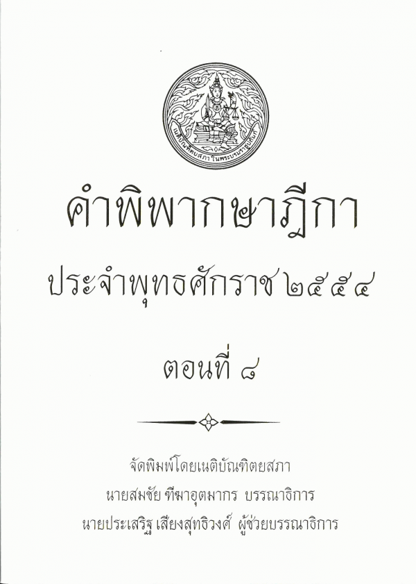 คำพิพากษาฎีกา ประจำพุทธศักราช 2554 ตอนที่ 8 / จัดพิมพ์โดยเนติบัณฑิตยสภา ; สมชัย ฑีฆาอุตมากร บรรณาธิการ ; ประเสริฐ เสียงสุทธิวงศ์ ผู้ช่วยบรรณาธิการ