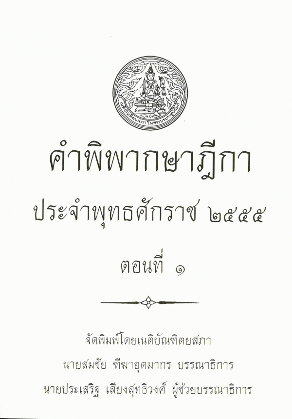คำพิพากษาฎีกา ประจำพุทธศักราช 2555 ตอนที่ 1 / จัดพิมพ์โดยเนติบัณฑิตยสภา ; สมชัย ฑีฆาอุตมากร บรรณาธิการ ; ประเสริฐ เสียงสุทธิวงศ์ ผู้ช่วยบรรณาธิการ