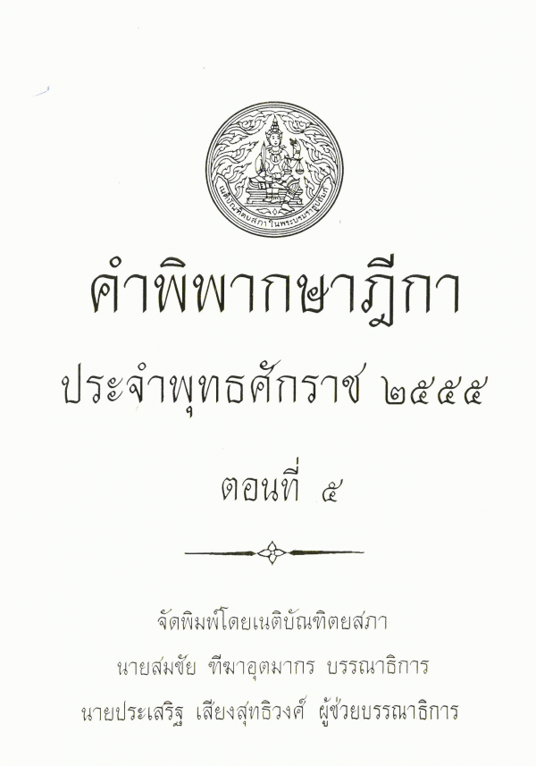 คำพิพากษาฎีกา ประจำพุทธศักราช 2555 ตอนที่ 5 / จัดพิมพ์โดยเนติบัณฑิตยสภา ; สมชัย ฑีฆาอุตมากร บรรณาธิการ ; ประเสริฐ เสียงสุทธิวงศ์ ผู้ช่วยบรรณาธิการ
