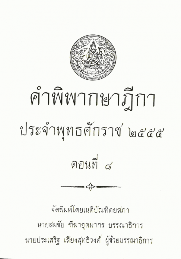 คำพิพากษาฎีกา ประจำพุทธศักราช 2555 ตอนที่ 8 / จัดพิมพ์โดยเนติบัณฑิตยสภา ; สมชัย ฑีฆาอุตมากร บรรณาธิการ ; ประเสริฐ เสียงสุทธิวงศ์ ผู้ช่วยบรรณาธิการ