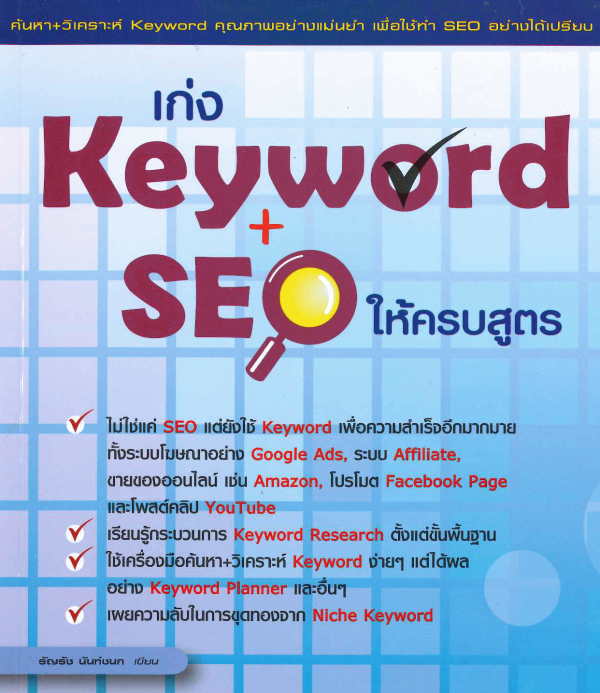 ทำความรู้จัก Keyword ให้ถึงกึ๋น หน้า 19-36 -- เก่งเรื่อง Keyword แล้วได้เปรียบยังไง หน้า 37-60 -- ใช้ Keyword เสิร์ชผ่าน Google แบบเซียน หน้า 61-80 -- Niche Keyword หาเป็นก็รวยได้ หน้า 81-102 -- Keyword กับ Google AdWords หน้า 103-124 -- Keyword กับ Google AdSense หน้า 125-144 -- ค้นหาและวิเคราะห์ Keyword ผ่านเว็บชั้นนำ หน้า 145-180 -- ใช้โปรแกรมค้นหาและวิเคราะห์ Keyword ชั้นเยี่ยม หน้า 181-210 -- Keyword Planner โคตรเครื่องมือค้นหา/วิเคราะห์ Keyword หน้า 211-240 -- เช็กความนิยมของ Keyword ผ่าน Google Trends หน้า 241-256 -- หัวใจสำคัญของ SEO และ Search Engine หน้า 257-278 -- ใช้ Keyword มาทำ SEO หน้า 279-310 -- ดัน Facebook Page ให้ขึ้นหน้าหนึ่ง Google หน้า 311-334 -- ใส่ Keyword ในบทความให้เข้าตำรา SEO หน้า 335-356