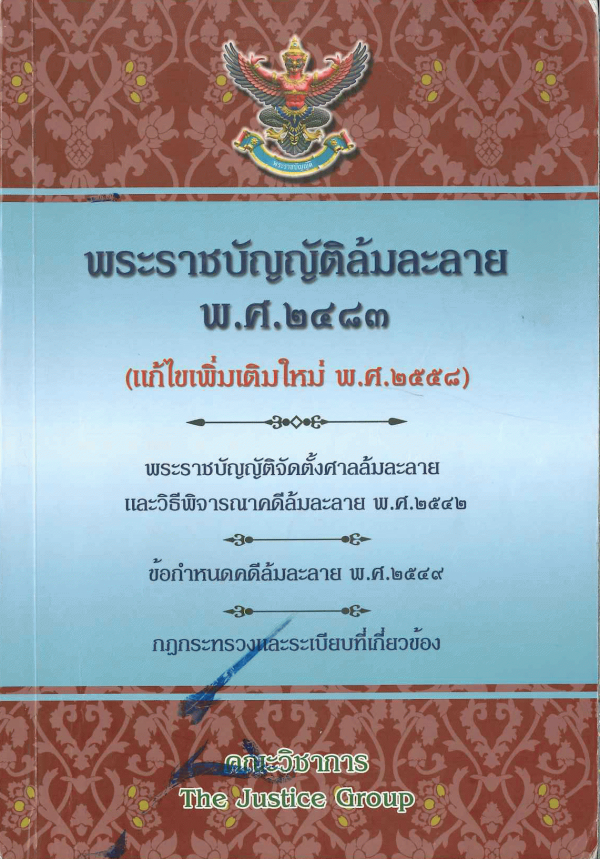 พระราชบัญญัติล้มละลาย พ.ศ. 2483 (แก้ไขเพิ่มเติมใหม่ พ.ศ. 2558) พระราชบัญญัติจัดตั้งศาลล้มละลายและวิธีพิจารณาคดีล้มละลาย พ.ศ. 2542 ข้อกำหนดคดีล้มละลาย พ.ศ. 2549 กฎกระทรวงและระเบียบที่เกี่ยวข้อง / คณะวิชาการ The Justice Group, ผู้รวบรวม