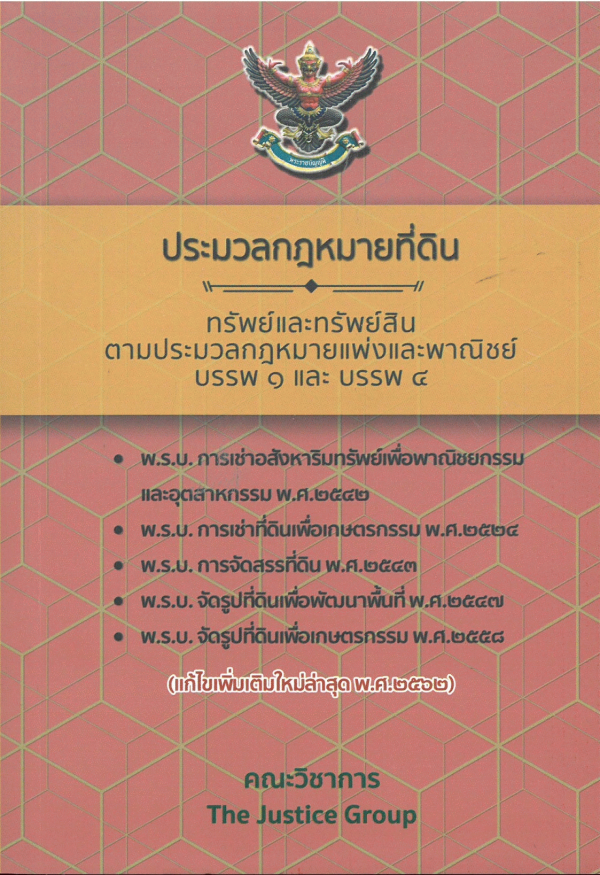 ประมวลกฎหมายที่ดิน พ.ศ. 2497 : ทรัพย์และทรัพย์สินตามประมวลกฎหมายแพ่งและพาณิชย์ บรรพ 1 และบรรพ 4 พ.ร.บ. การเช่าอสังหาริมทรัพย์เพื่อพาณิชยกรรมและอุตสาหกรรม พ.ศ. 2542 พ.ร.บ. การเช่าที่ดินเพื่อเกษตรกรรม พ.ศ. 2524 พ.ร.บ. การจัดสรรที่ดิน พ.ศ. 2543 พ.ร.บ. จัดรูปที่ดินเพื่อพัฒนาพื้นที่ พ.ศ. 2547 พ.ร.บ. จัดรูปที่ดินเพื่อเกษตรกรรม พ.ศ. 2558 (แก้ไขเพิ่มเติมใหม่ล่าสุด พ.ศ. 2562) / คณะวิชาการ The Justice Group