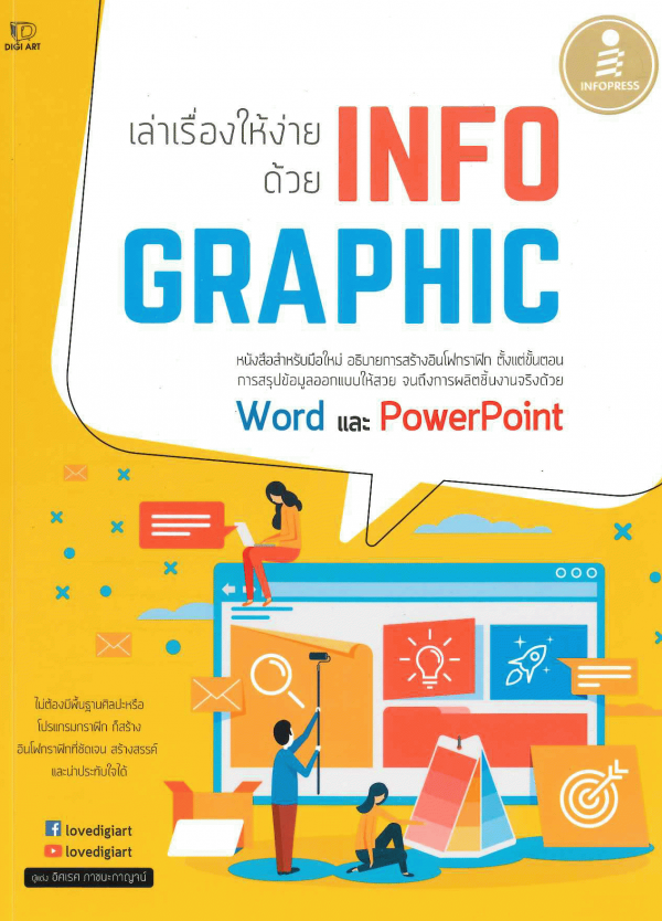 Intro รู้จักกับอินโฟกราฟิก หน้า 1-22 -- นำข้อมูลมาเล่าให้เข้าใจง่าย หน้า 23-40 -- พื้นฐานการออกแบบที่ควรจะรู้ หน้า 41-78 -- ออกแบบลงกระดาษก่อนทำจริง หน้า 79-86 -- ทำอินโฟกราฟิกง่ายๆได้ด้วย Word หน้า 87-118 -- ทำอินโฟกราฟิกง่ายๆ ได้ด้วย PowerPoint หน้า 119-148 -- ทำตัวอักษรให้น่าสนใจได้ด้วย Word และ PowerPoint หน้า 149-186 -- วาดกราฟิกง่ายๆ ไว้ใช้เองได้ด้วย Word และ PowerPoint หน้า 187-234 -- ตัวช่วยดีๆ จากเว็บฯ ฟรีต่างๆ หน้า 235-243