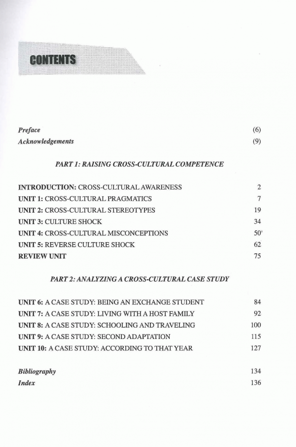 PART 1 Raising Cross-cultural Competence : Cross-Cultural Pragmatics p.7-18 -- Cross-Cultural Stereotypes p.19-33 -- Culture Shock p.34-49 -- Cross-Cultural Misconceptions p.50-61 -- Reverse Culture Shock p.62-74 -- Review Unit p.75-83