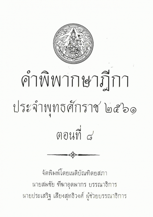คำพิพากษาฎีกา ประจำพุทธศักราช 2561 ตอนที่ 8 / จัดพิมพ์โดยเนติบัณฑิตยสภา ; สมชัย ฑีฆาอุตมากร บรรณาธิการ ; ประเสริฐ เสียงสุทธิวงศ์ ผู้ช่วยบรรณาธิการ