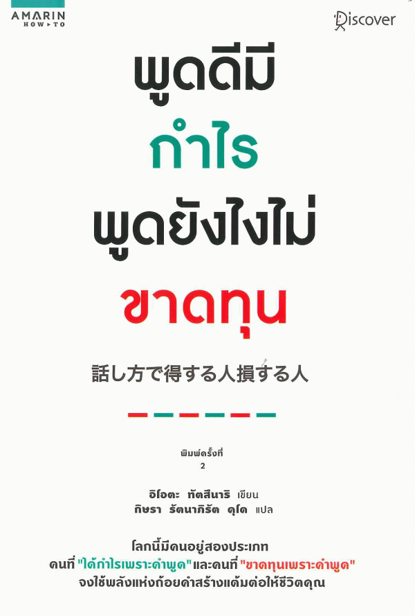 TextPublication details: กรุงเทพฯ : อมรินทร์ฮาวทู, 2563Edition: พิมพ์ครั้งที่ 2Notes: พิมพ์ซ้ำกับฉบับพิมพ์ครั้งแรก 2563; แปลจาก Hanashikata de sonsuru hito tokusuru hitoDescription: 163 หน้า : ภาพประกอบ ; 21 ซมISBN: - 9786161836870
