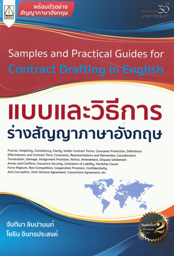 เทคนิคการร่างสัญญาภาษาอังกฤษ หน้า 1-12 -- โครงสร้าง พิธีการ และหลักกฎหมายที่เกี่ยวกับการร่างสัญญา หน้า 13-31 -- องค์ประกอบและข้อสัญญาพื้นฐานของสัญญาส่วนใหญ่ หน้า 32-101 -- ข้อสัญญาพิเศษที่มีในบางสัญญา หน้า 102-144 -- ตัวอย่างสัญญาซื้อขายสังหาริมทรัพย์ หน้า 145199 -- ตัวอย่างสัญญาซื้อขายอสังหาริมทรัพย์ หน้า 200-238 -- ตัวอย่างสัญญาแลกเปลี่ยนสิ่งของ หน้า 239-251 -- ตัวอย่างสัญญาให้ หน้า 252-254 -- ตัวอย่างสัญญาเช่าสังหาริมทรัพย์ หน้า 255-261 -- ตัวอย่างสัญญาเช่าอสังหาริมทรัพย์ หน้า 262-275 -- ตัวอย่างสัญญาเช่าซื้อ หน้า 276-285 -- ตัวอย่างสัญญาจ้างแรงงาน หน้า 286-292 -- ตัวอย่างสัญญาจ้างทำของ หน้า 293-312 -- ตัวอย่างสัญญาขนส่ง หน้า 313-332 -- ตัวอย่างสัญญากู้ยืมเงินและค้ำประกัน หน้า 333-342 -- ตัวอย่างสัญญาฝากทรัพย์ หน้า 343-353 -- ตัวอย่างสัญญาจำนอง หน้า 354-378 -- ตัวอย่างสัญญาจำนำ หน้า 379-390 -- ตัวอย่างสัญญาแต่งตั้งผู้แทนจำหน่าย หน้า 391-410 -- ตัวอย่างสัญญานายหน้า หน้า 411-420 -- ตัวอย่างสัญญาประนีประนอมยอมความ หน้า 421-424 -- ตัวอย่างสัญญาพิเศษ หรือเอกสารอื่นๆ หน้า 425-457 -- คำหรือวลีพื้นฐานที่ใช้ในการ่างสัญญา หน้า 458-467 -- บทส่งท้าย ข้อคิดในการร่างสัญญาในยุคแห่งการเปลี่ยนแปลง หน้า 468-470