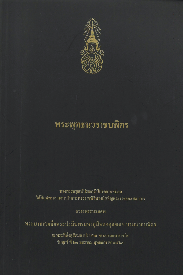 TextPublication details: กรุงเทพฯ : บริษัทอมรินทร์พริ้นติ้งแอนด์พับลิชชิ่ง จำกัด (มหาชน), 2560Notes: ทรงพระกรุณาโปรดเกล้าโปรดกระหม่อมให้พิมพ์พระราชทานในการพระราชพิธีทรงบำเพ็ญพระราชกุศลสตมวาร ถวายพระบรมศพ พระบาทสมเด็จพระปรมินทรมหาภูมิพลอดุลยเดช บรมนาถบพิตร ณ พระที่นั่งดุสิตมหาปราสาท พระบรมมหาราชวัง วันศุกร์ ที่ 20 มกราคม พุทธศักราช 2560Description: 201 หน้า : ภาพประกอบ ; 26 ซมISBN: - 9786167267630