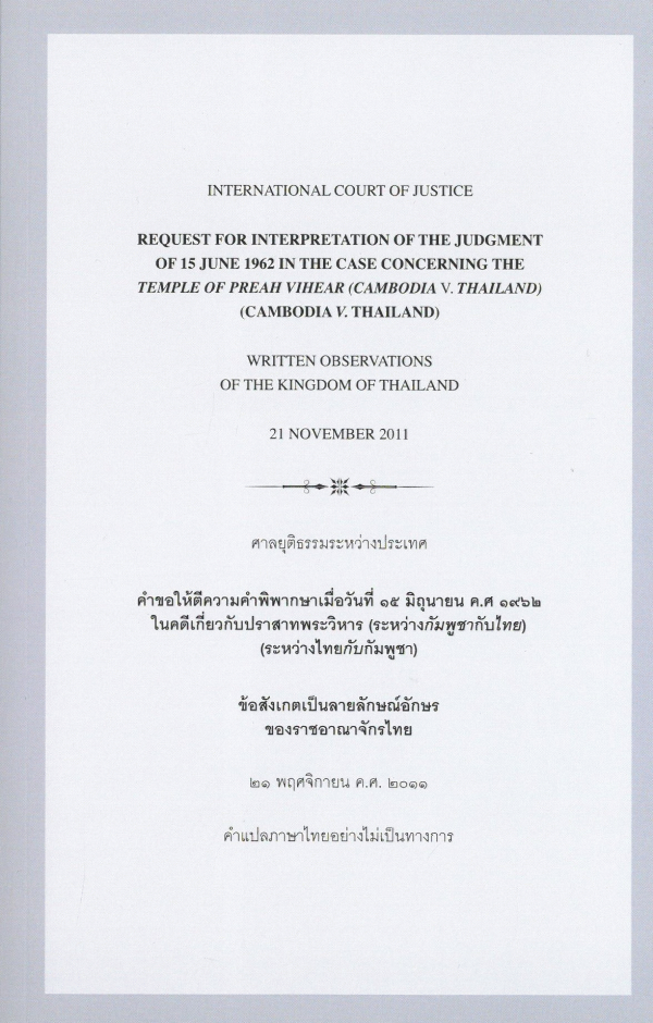 คำขอให้ตีความคำพิพากษาเมื่อวันที่ 15 มิถุนายน ค.ศ. 1962 ในคดีเกี่ยวกับปราสาทพระวิหาร (ระหว่างกัมพูชากับไทย) (ระหว่างไทยกับกัมพูชา) : ข้อสังเกตเป็นลายลักษณ์อักษรของราชอาณาจักรไทย 21 พฤศจิกายน ค.ศ. 2011 = Request for interpretation of the judgment of 15 June 1962 in the case concerning the Temple of Preah Vihear (Cambodia V. Thailand) (Cambodia V. Thailand) : written observations of the Kingdom of Thailand : 21 November 2011 / ศาลยุติธรรมระหว่างประเทศ