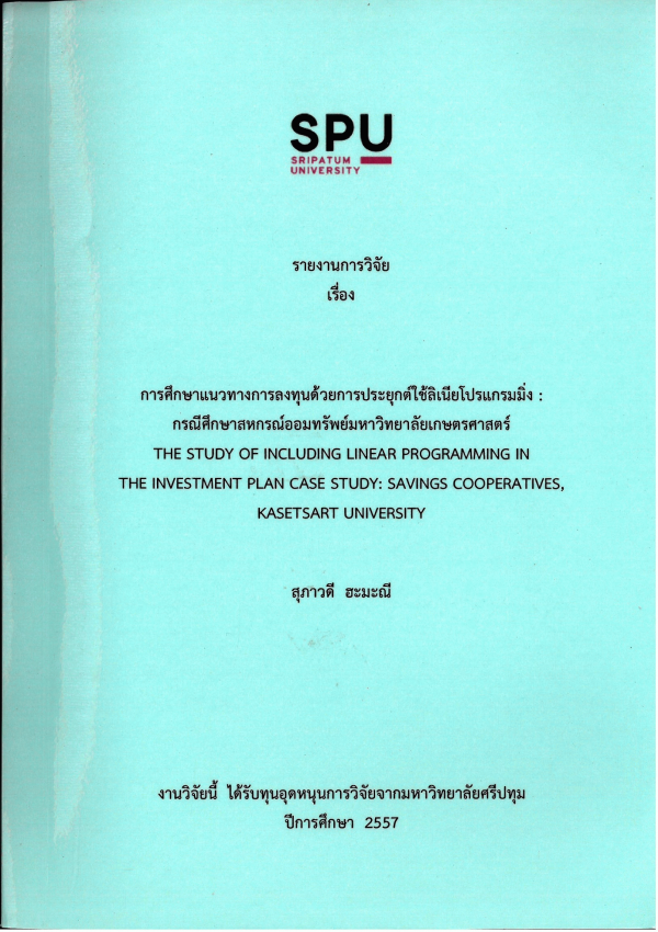 รายงานการวิจัย เรื่อง การศึกษาแนวทางการลงทุนด้วยการประยุกต์ใช้ลิเนียโปรแกรมมิ่ง : กรณีศึกษาสหกรณ์ออมทรัพย์มหาวิทยาลัยเกษตรศาสตร์ = The study of including linear programming in the investment plan case study : savings cooperatives, Kasetsart University / สุภาวดี ฮะมะณี