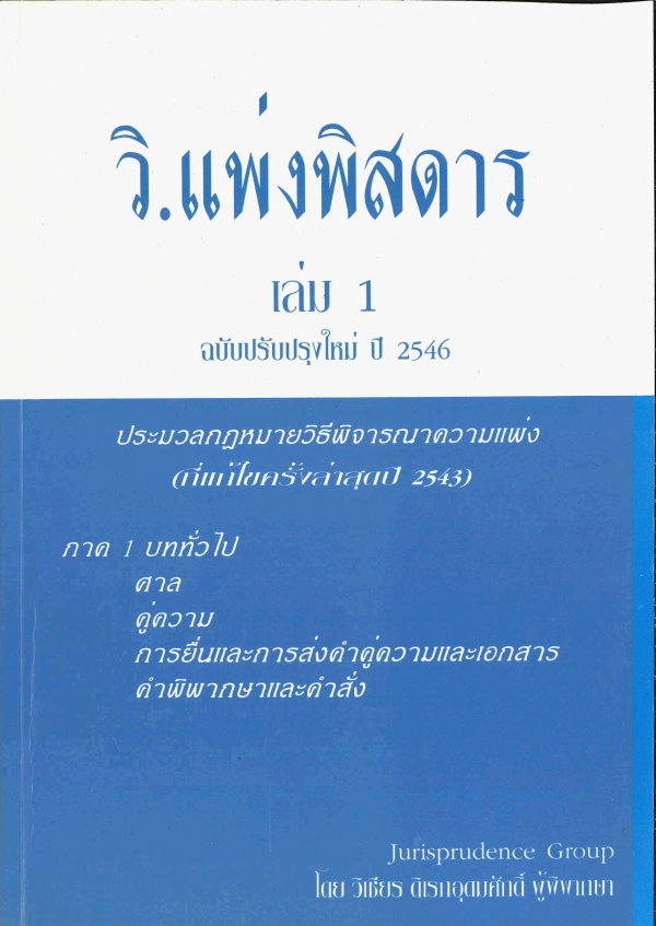 วิ. แพ่งพิสดาร เล่ม 1 (ฉบับปรับปรุงใหม่ ปี พ.ศ. 2546) : ประมวลกฎหมายวิธีพิจารณาความแพ่ง (ที่แก้ไขครั้งล่าสุดปี 2543) ภาค 1 บททั่วไป ศาล คู่ความ การบื่นและการส่งคำคู่ความและเอกสาร คำพิพากาาและคำสั่ง / วิเชียร ดิเรกอุดมศักดิ์