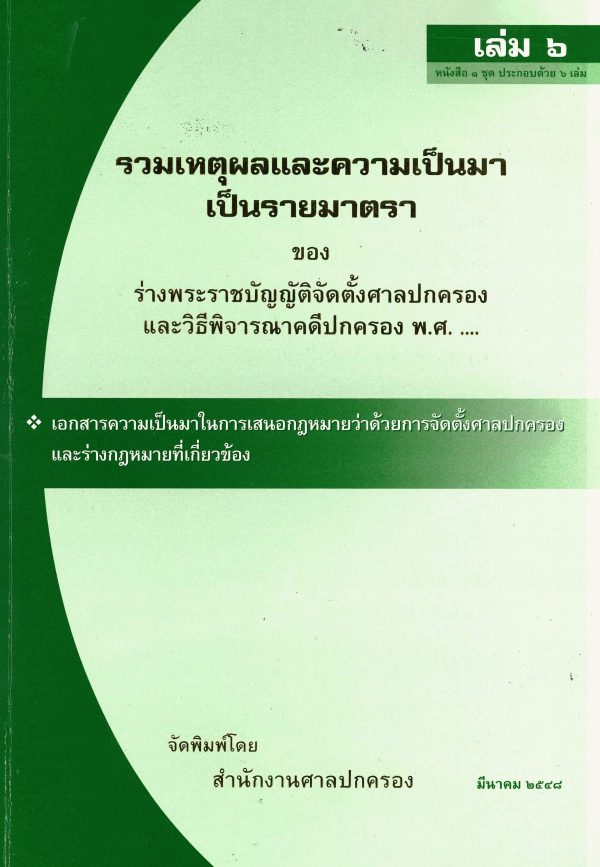 รวมเหตุผลและความเป็นมาเป็นรายมาตราของร่างพระราชบัญญัติจัดตั้งศาลปกครองและวิธีพิจารณาคดีปกครอง พ.ศ. ... เล่ม 6 เอกสารความเป็นมาในการเสนอกฎหมายว่าด้วยการจัดตั้งศาลปกครองและร่างกฎหมายที่เกี่ยวข้อง ... / สำนักวิจัยและวิชาการ สำนักงานศาลปกครอง