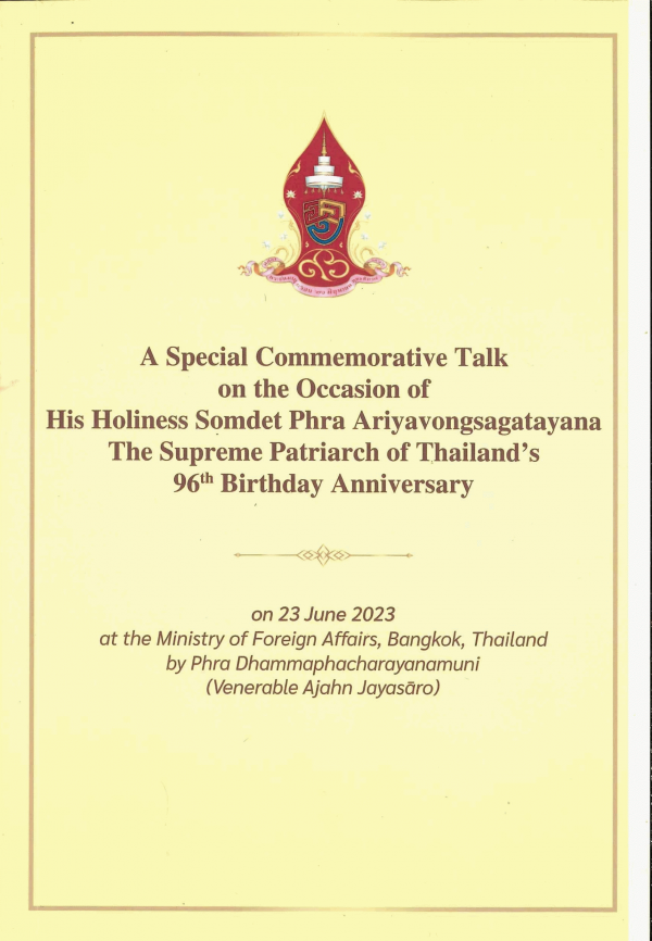 A Special Commemorative Talk on the Occasion of His Holiness Somdet Phra Ariyavongsagatayana The Supreme Patriarch of Thailand’s 96th Birthday Anniversary / Ministry of Foreign Affairs