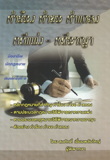 คำร้อง คำขอ คำแถลง ตามประมวลกฎหมายวิธีพิจารณาความแพ่ง หน้า 3-550 -- คำร้อง คำขอ คำแถลง ตามประมวลกฎหมายวิธีพิจารณาความอาญา หน้า 551-628