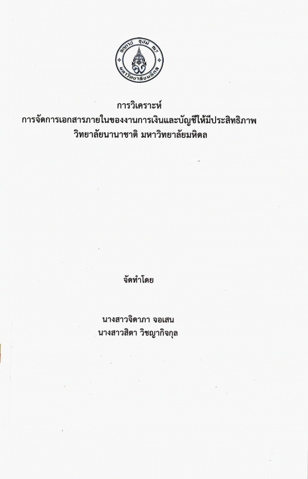 การวิเคราะห์การจัดการเอกสารภายในของงานการเงินและบัญชีให้มีประสิทธิภาพ วิทยาลัยนานาชาติ มหาวิทยาลัยมหิดล / จัดทำโดย จิดาภา จอเสน, สิตา วิชญากิจกุล