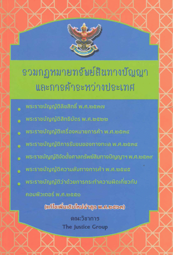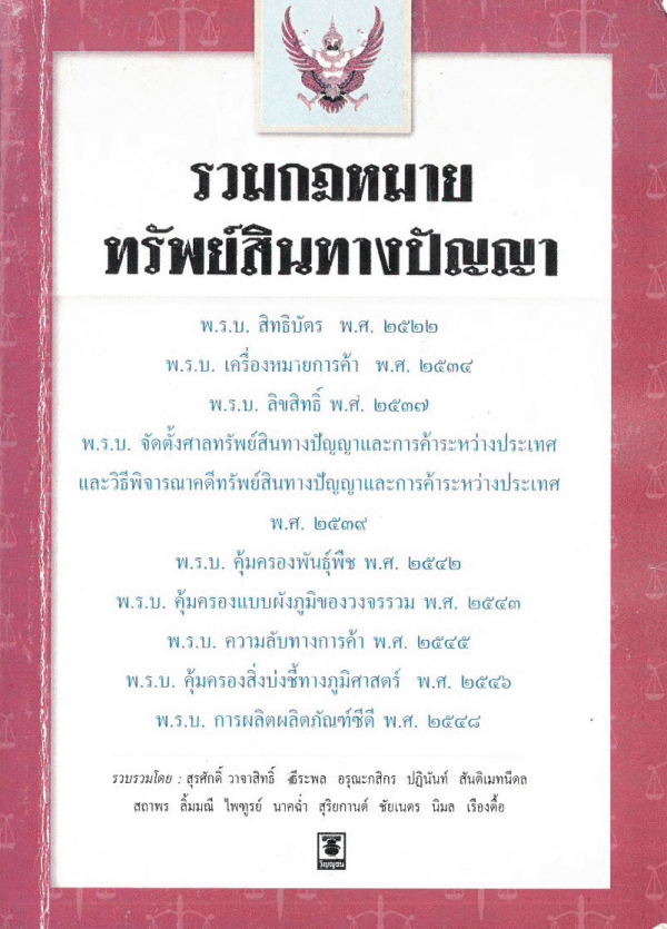 Other title: - รวมกฎหมายทรัพย์สินทางปัญญา และการค้าระหว่างประเทศ พระราชบัญญัติลิขสิทธิ์ พ.ศ. 2537 พระราชบัญญัติสิทธิบัตร พ.ศ.2522 พระราชบัญญัติเครื่องหมายการค้า พ.ศ.2534 พระราชบัญญัติการรับขนของทางทะเล พ.ศ.2534 พระราชบัญญัติจัดตั้งศาลทรัพย์สินทางปัญญาฯ พ.ศ.2539 พระราชบัญญัติความลับทางการค้า พ.ศ.2545 พระราชบัญญัติว่าด้วยการกระทำความผิดเกี่ยวกับคอมพิวเตอร์ พ.ศ.2550 (แก้ไขเพิ่มเติมใหม่ล่าสุด พ.ศ.25ุ63) ชื่อเรื่องปกหน้า